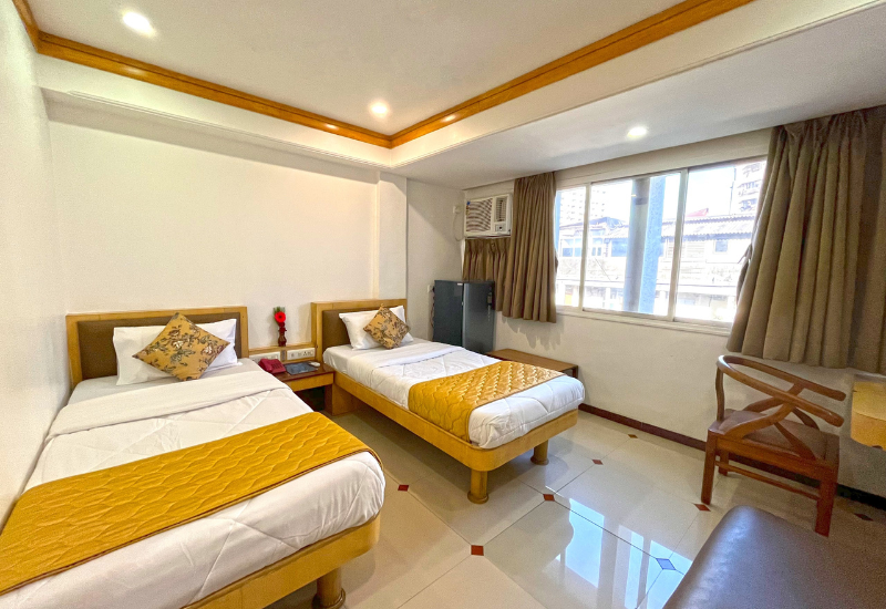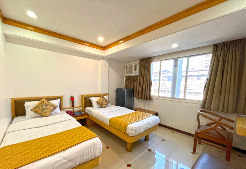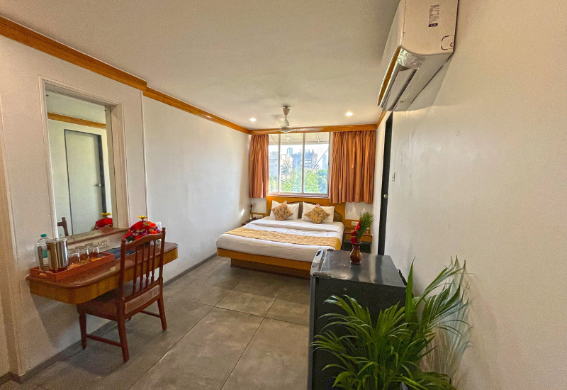 The Deluxe rooms are spacious with an area of approximately 200 square feet. They are smartly done rooms with pinewood laminate and tastefully done upholstery. They come with a 32 inch flat screen tv, free wifi, a desk and a sofa.
